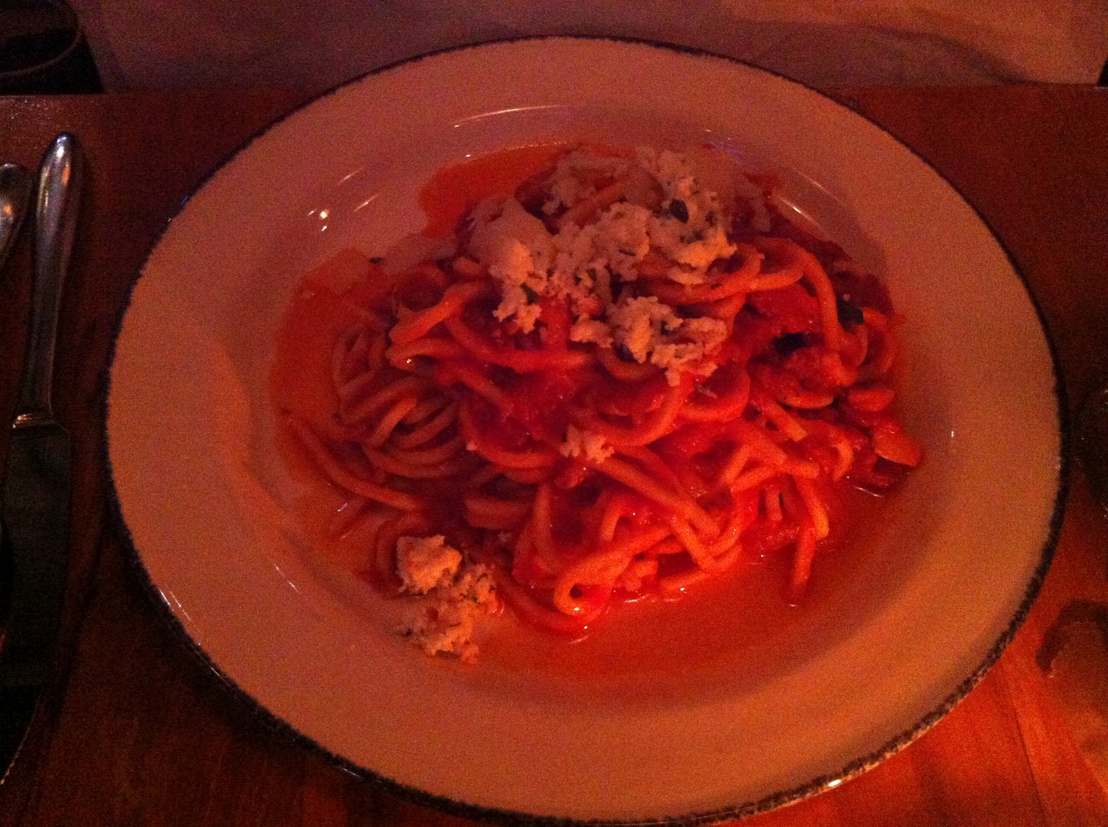The Spaghetti Chitarra all’Amatriciana was another mammoth dish of pasta that consisted of (according to their menu) "tomato, Pingue guanciale, thai chili, pecorino." The spaghetti was quite thick and was more a bucatini type pasta but it was also cooked perfectly al dente like the rigatoni. The sauce was good but it didn't taste like it was seasoned enough, it taste more like seasoned crushed tomatoes then sauce to me. Maybe some people like that but for me it seemed a bit under seasoned.