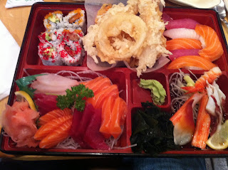 This ginormous bento had so much food packed into it that I'm fairly certain that it could have fed a family of four or apparently just me (a very rollie-polly me). This bento had 6 maki rolls, a mound of tempura vegetables, tempura shrimp, 6 pieces of nigiri, 12-16 pieces of sashimi, and finally a seafood salad. Oh, I forgot to mention that all bentos come with an additional salad, miso soup, and green tea ice cream (yes i did consume all this).